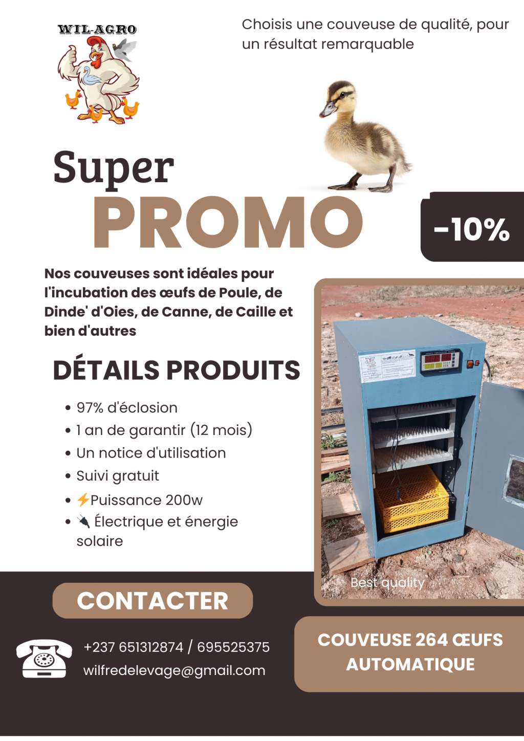 Profitez de notre couveuse automatique d’une capacité de 264 œufs, idéale pour les éleveurs professionnels et ambitieux.